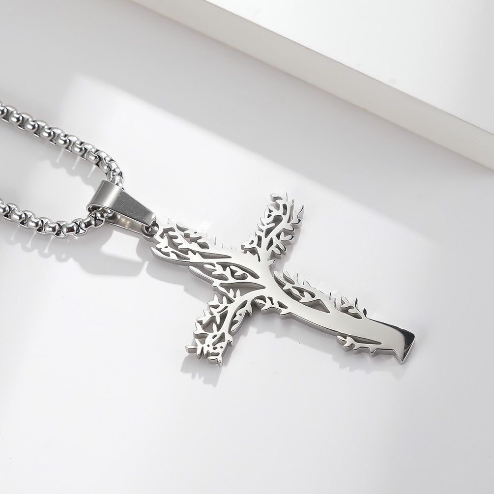 Cross-border Amazon European And American Style Stainless Steel Lucky Tree Cross Necklace Male And Female Personality Wear Titanium Steel Pendant